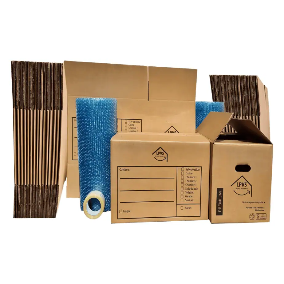 Je suis pleinement satisfait de ce kit de déménagement utilisé pour mon T4. Les cartons avec poignées sont solides et inspirent confiance. Aucun risque pour votre vaisselle de tomber au sol… Le MADE IN FRANCE est clairement un plus. Papier bulle en rouleau et adhésif inclus. Je recommande sans hésiter.